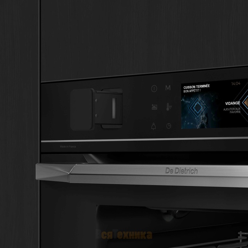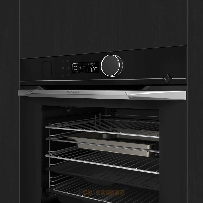 Духовой шкаф De Dietrich DOR4546XE в глубоком чёрном оттенке с декоративной фурнитурой из нержавеющей стали отражает философию коллекции Philharmonie и подчёркивает принадлежность серии STELLAR STEEL (PHILHARMONIE).