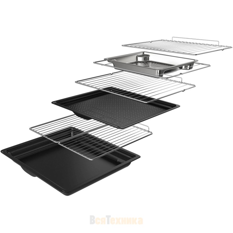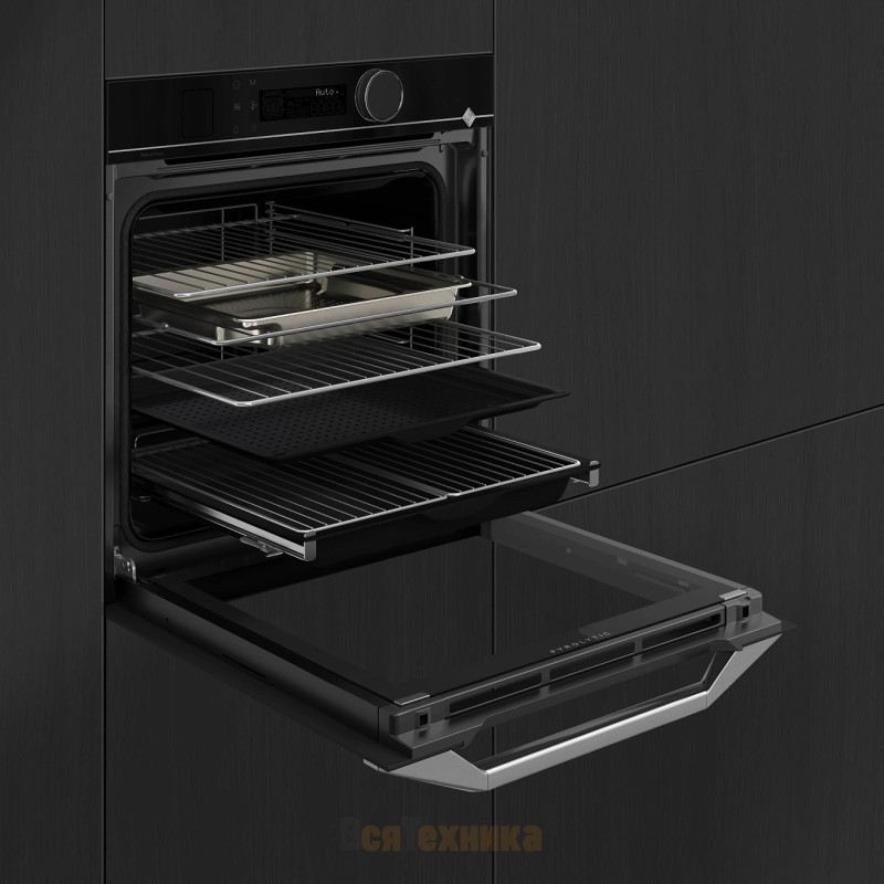 Для работы с крупными противнями предусмотрен стандартный паровой противень maxi 45 см; внутренняя поверхность дверцы выполнена полностью из стекла, состоящего из четырёх теплоизоляционных слоёв, что вместе с «холодной дверцей» и мягким закрыванием Soft‑close усиливает комфорт и безопасность. Галогенное внутреннее освещение обеспечивает чёткую видимость без лишней засветки, а телескопические направляющие упрощают извлечение посуды на любом этапе.