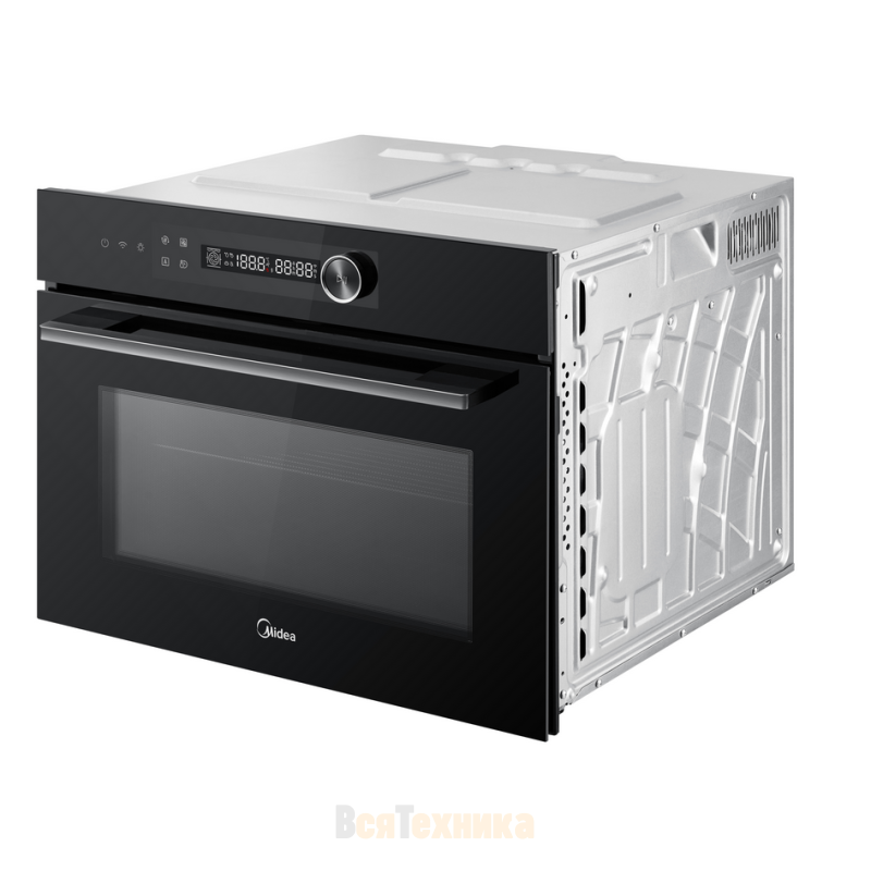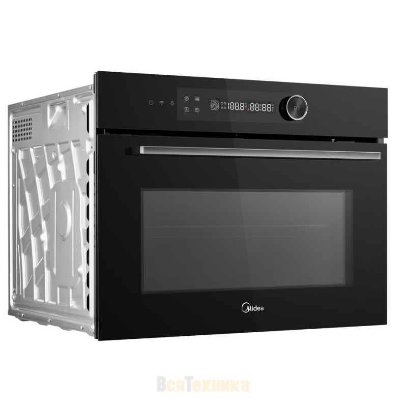 Количество режимов работы в духовом шкафу Мидеа: 11. В число доступных программ входят: классический нагрев, нижний нагрев, конвекция, приготовление с помощью микроволн, гриль для создания хрустящей корочки, пицца, и другие. Тип гриля в этой модели — электрический.