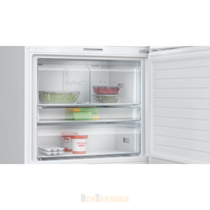 Морозильный блок оснащён тремя вместительными ящиками, включая большой лоток BigBox для крупногабаритных заготовок; функция SuperFreezing обеспечивает быстрое и глубокое замораживание, что особенно важно при закладке большого объёма свежих продуктов.