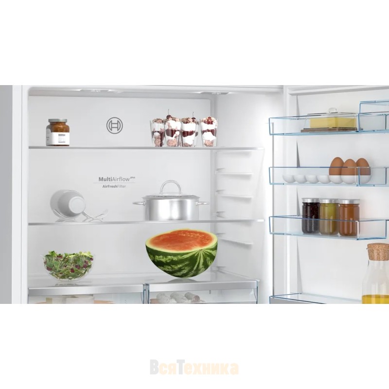 Общий полезный объём достигает внушительных 624 литров — 422 литра выделено под охлаждение и 202 литра отведено для заморозки. Для сохранения качества продуктов использованы современные технологические подходы: динамическая система распределения воздуха MultiAirflow обеспечивает равномерное распределение температуры по полкам, а функция суперохлаждения позволяет быстро понизить температуру свежих закладок, минимизируя влияние на уже охлаждённые продукты.