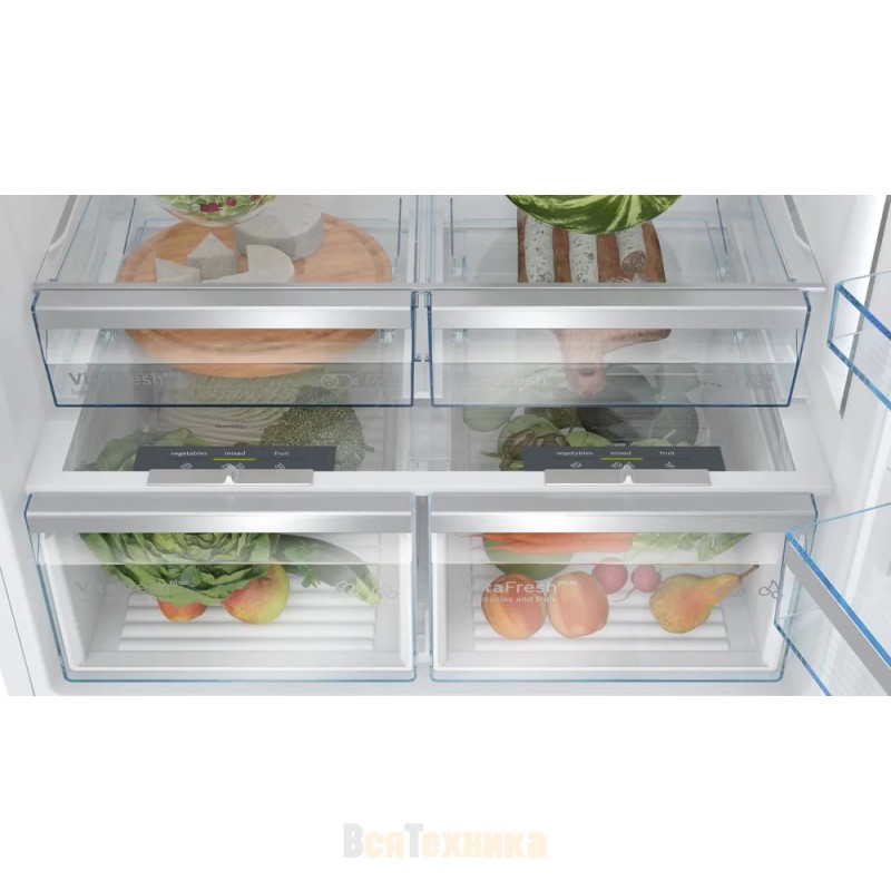 В дверце предусмотрена полка для бутылок и три подставки для яиц, а светодиодное внутреннее освещение обеспечивает равномерный и экономичный световой поток, упрощающий обзор даже в тёмное время суток. Для хранения фруктов и овощей предусмотрена зона VitaFresh, которая помогает дольше сохранять полезные качества и структуру продуктов за счёт оптимального уровня влажности и температурного режима.
