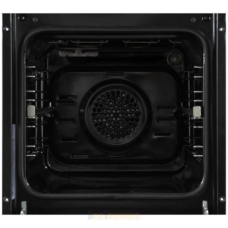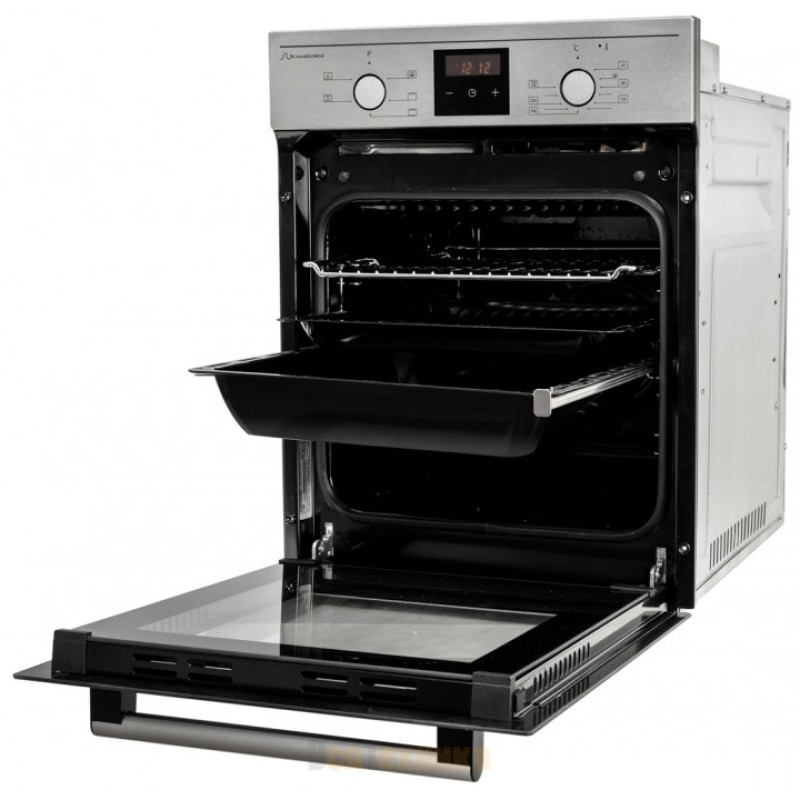 В комплект входят хромированная решетка и два противня с антипригарным покрытием — универсальный и глубокий. Дверца духовки имеет двойное остекление, предохраняющее от ожогов, и также обработана от отпечатков пальцев. Особая конструкция петель позволяет открывать и закрывать ее плавно и бесшумно, так что выпечка в камере не опадает. Об экономичной работе устройства свидетельствует высокий класс энергоэффективности А.