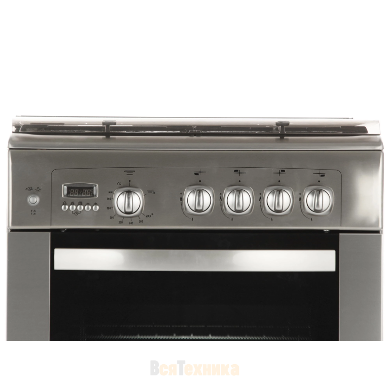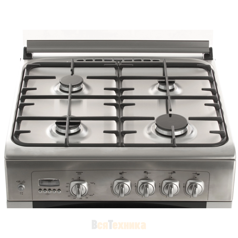 Варочная поверхность оснащена четырьмя конфорками, включая усиленную мощностью до 3,1 кВт, которая идеально подходит для интенсивного нагрева или работы с крупной посудой. Чугунные решётки обеспечивают устойчивость и долговечность, а встроенный электроподжиг в ручках избавляет от необходимости использовать спички. Система газ-контроля присутствует как на конфорках, так и в духовке — пламя автоматически отключается при его затухании, что повышает безопасность эксплуатации.