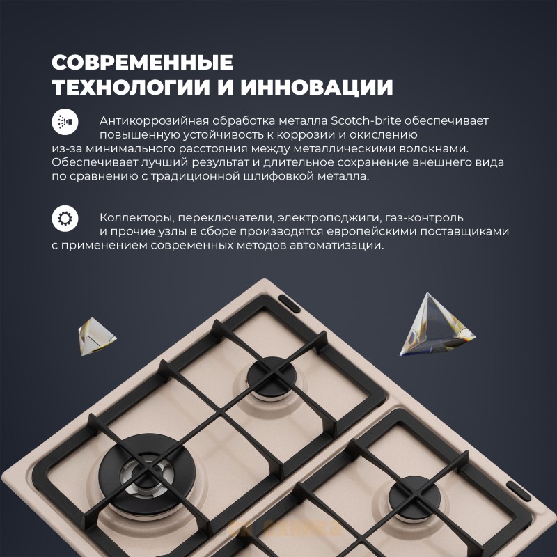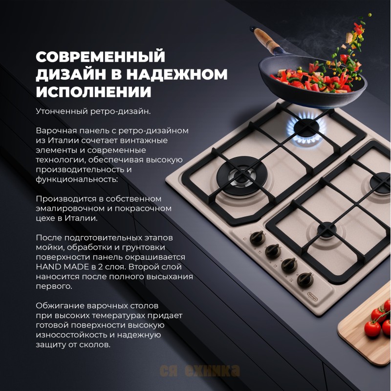 Панель имеет бронзовые ретро-переключатели и бежевую эмалированную поверхность. Управление осуществляется через переднюю панель. В комплекте с панелью поставляются чугунные составные решетки и набор жиклеров для работы с баллонным газом, а также крепление для встраивания в столешницу.