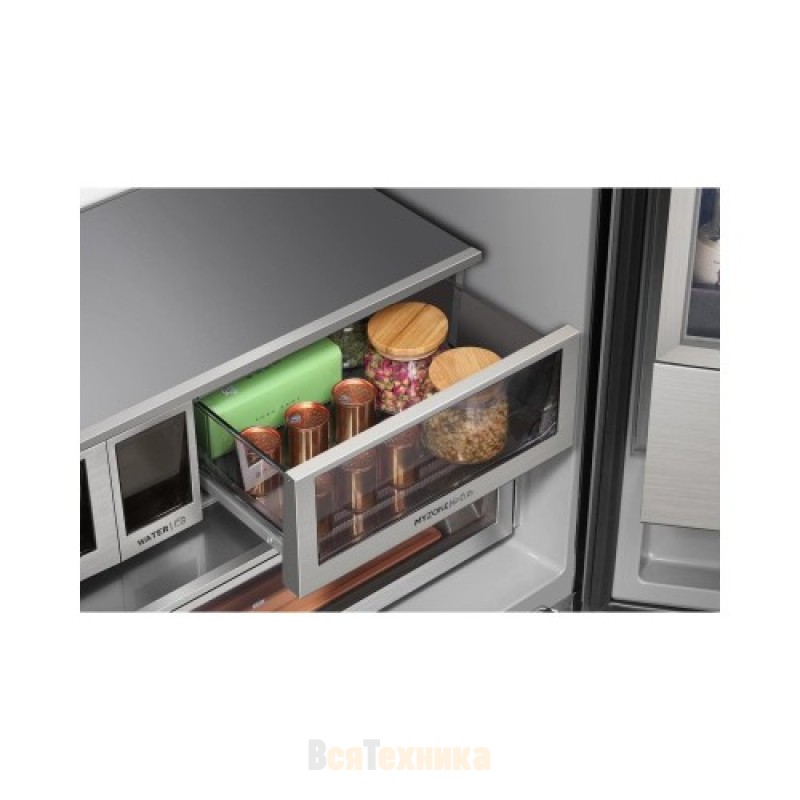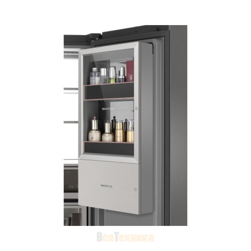 В повседневной эксплуатации удобно, что дверцы оснащены датчиком движения: дисплей и подсветка включаются, как только человек подходит ближе. Внутри предусмотрены зоны для хранения уходовых и косметических средств с возможностью включения напоминаний. Морозильная камера дополнена выдвижными телескопическими направляющими, а автоматический ледогенератор поставляется вместе с контейнером.
