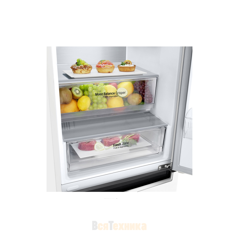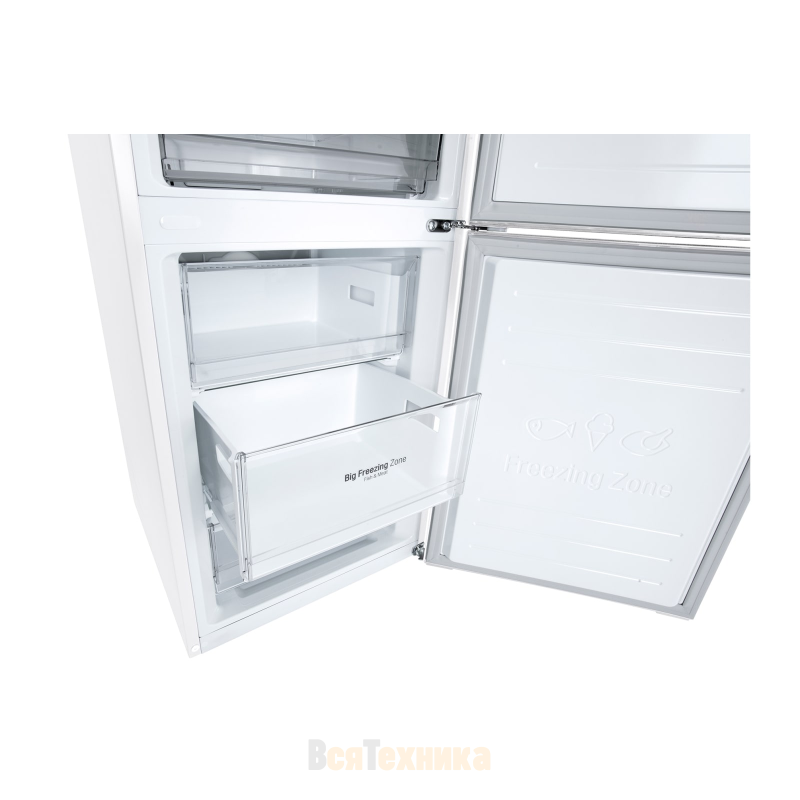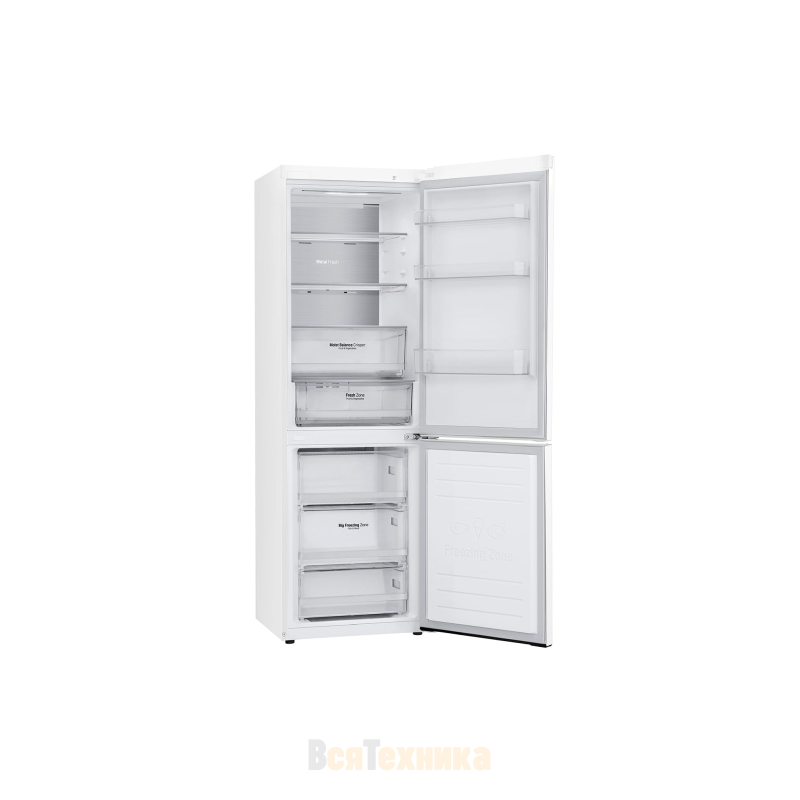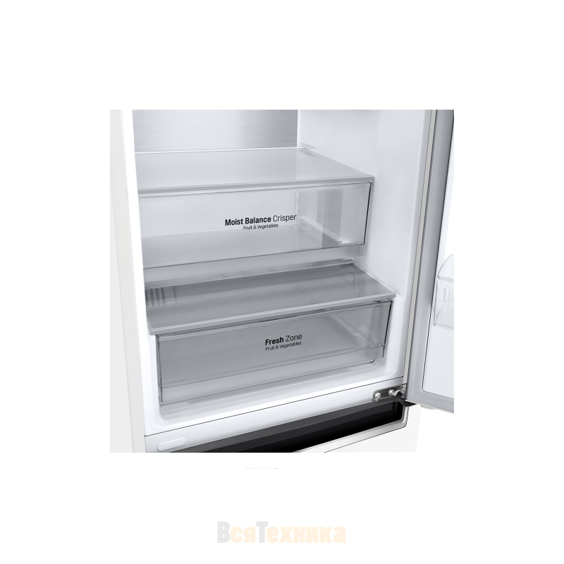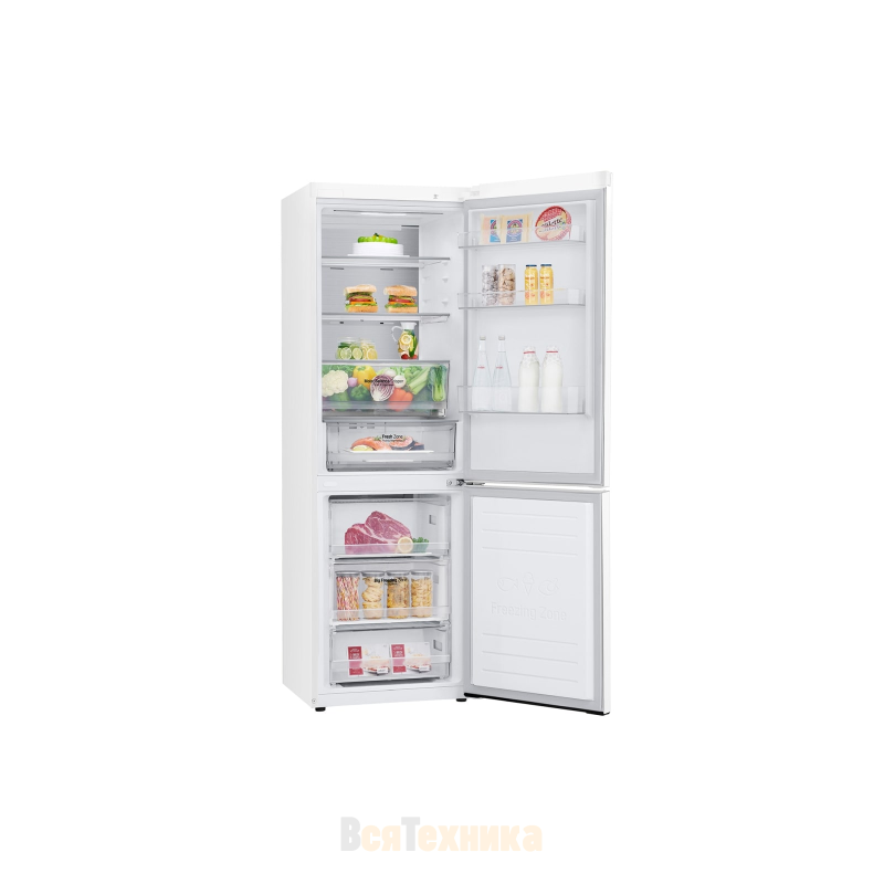LG GA-B459SQQM Это белый холодильник с нижней морозильной камерой создаёт ощущение аккуратного и продуманного устройства, которое легко вписывается в кухонное пространство благодаря стандартной ширине 59,5 сантиметра и высоте 186 сантиметров.