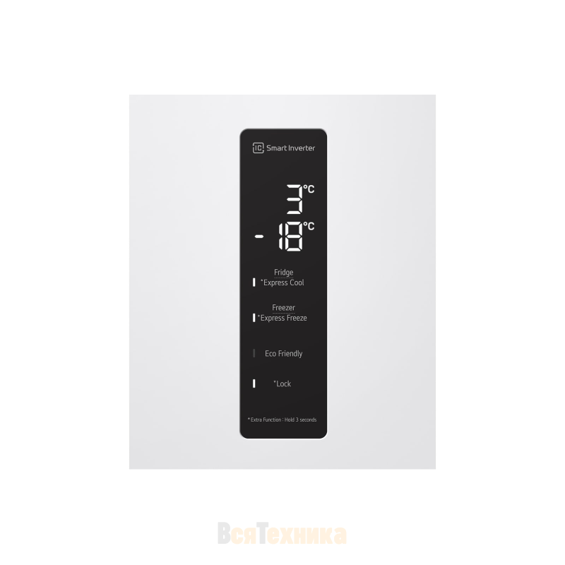 Управление реализовано через сенсорную панель на дверце, где цифровой LED-дисплей отображает температуру обеих камер и выбранные режимы. Модель поддерживает Wi-Fi и приложение LG ThinQ, что позволяет регулировать параметры со смартфона и получать уведомления о состоянии техники. Умная система Smart Diagnosis помогает быстро определить возможные ошибки, упрощая обслуживание.