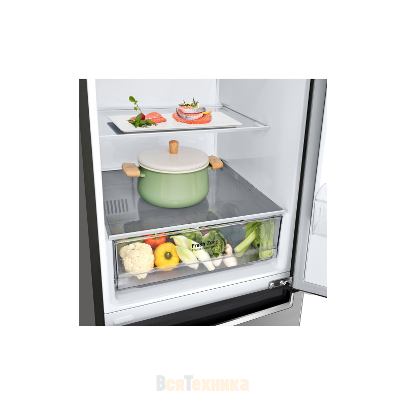 Влажная зона свежести с отдельным контейнером поддерживает подходящий уровень влажности для овощей и зелени, что продлевает их естественную свежесть. Технологии DoorCooling+ и Multi Air Flow обеспечивают быстрое и равномерное поступление холодного воздуха, благодаря чему температура стабилизируется даже при частом открывании дверцы. Суперохлаждение помогает быстро привести новые продукты к нужной температуре, что особенно удобно после крупных покупок.