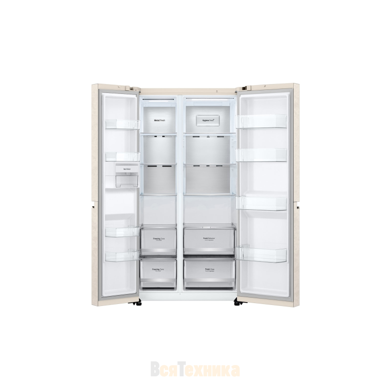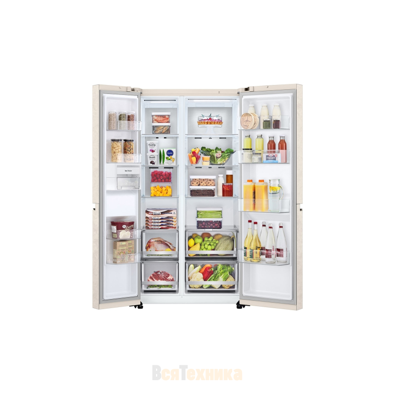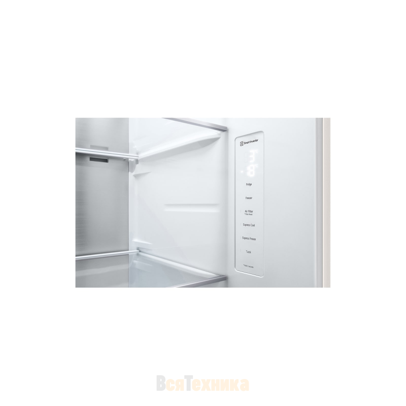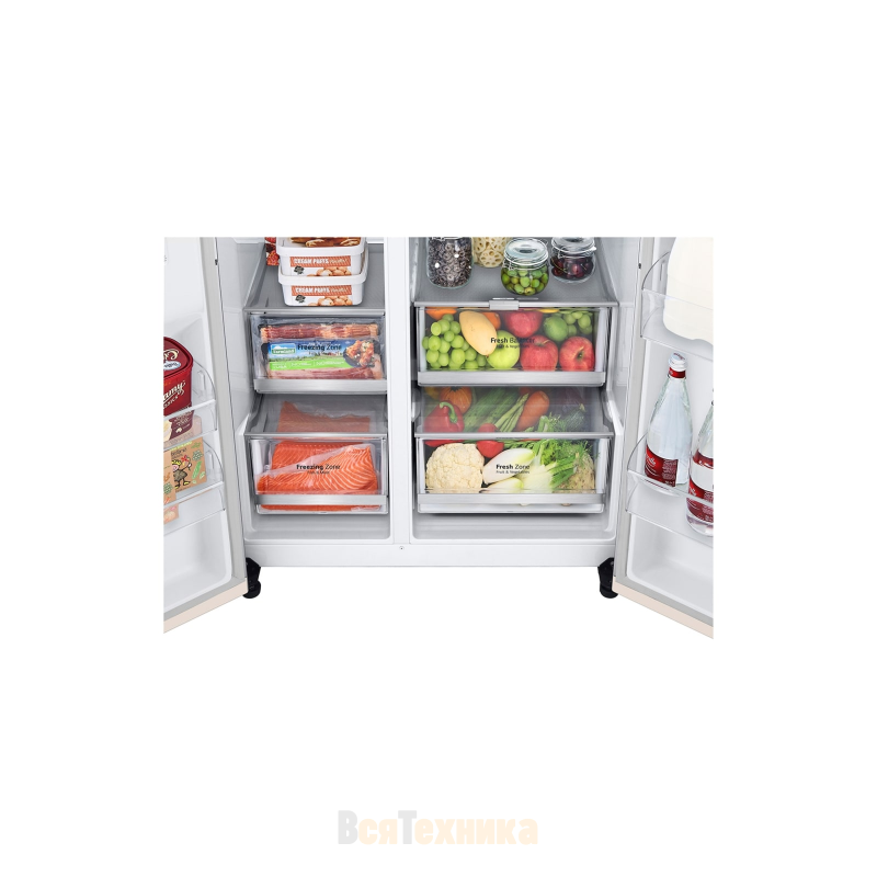 Этот холодильник LG GC-B257SEZV формата Side by Side сразу обращает на себя внимание впечатляющим внутренним пространством, которое достигает 647 литров полезного объёма. Такое разделение камер делает хранение продуманным: справа размещена холодильная часть объёмом 414 литров, а слева располагается морозильная камера на 233 литра.