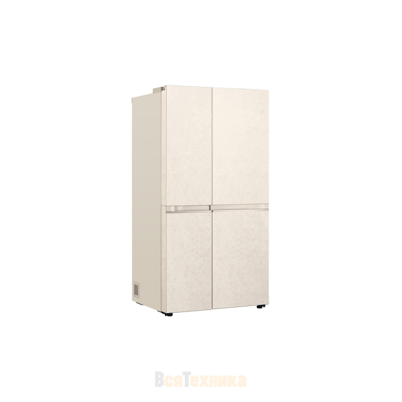 Конструкция холодильника предполагает открывание дверей в обе стороны — направо и налево, сохраняя формат French Door, который делает доступ к продуктам особенно удобным. Полки, выполненные в прозрачных и серебристых оттенках, создают аккуратный визуальный порядок, а металлические двери в бежевом цвете добавляют модели современный и спокойный характер.