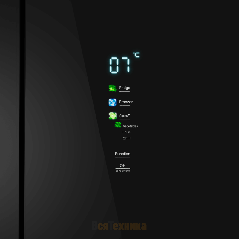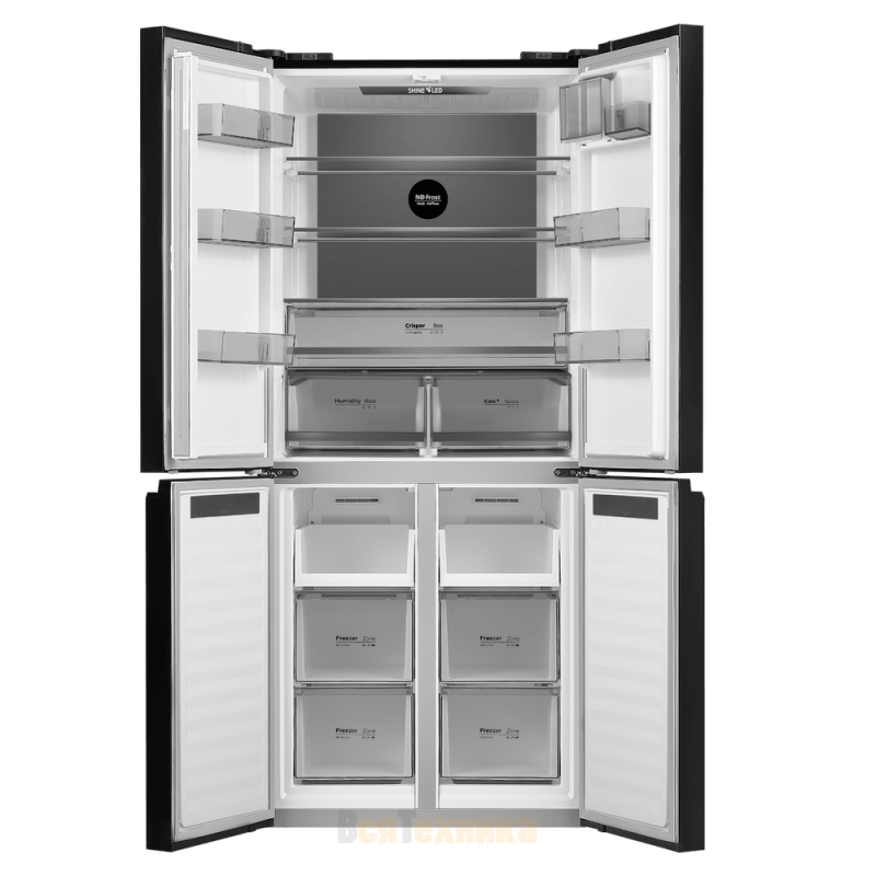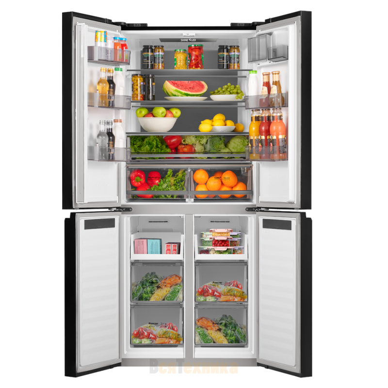 Общий объём модели составляет 518 литров, а полезный достигает 510 литров, что обеспечивает значительное пространство для хранения продуктов. Холодильная камера рассчитана на 334 литра и включает три прочных полки, а также три вместительных ящика, позволяющих удобно сортировать свежие продукты. Семь боковых полок создают дополнительные возможности для размещения бутылок, банок и мелких упаковок. LED-подсветка равномерно освещает камеру, делая её содержимое хорошо видимым в любое время суток.