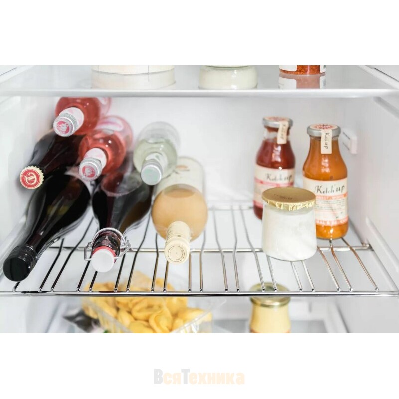 Внутреннее оснащение включает полку для бутылок и регулируемые полки. Дверца оборудована системой плавного закрывания Soft Close.