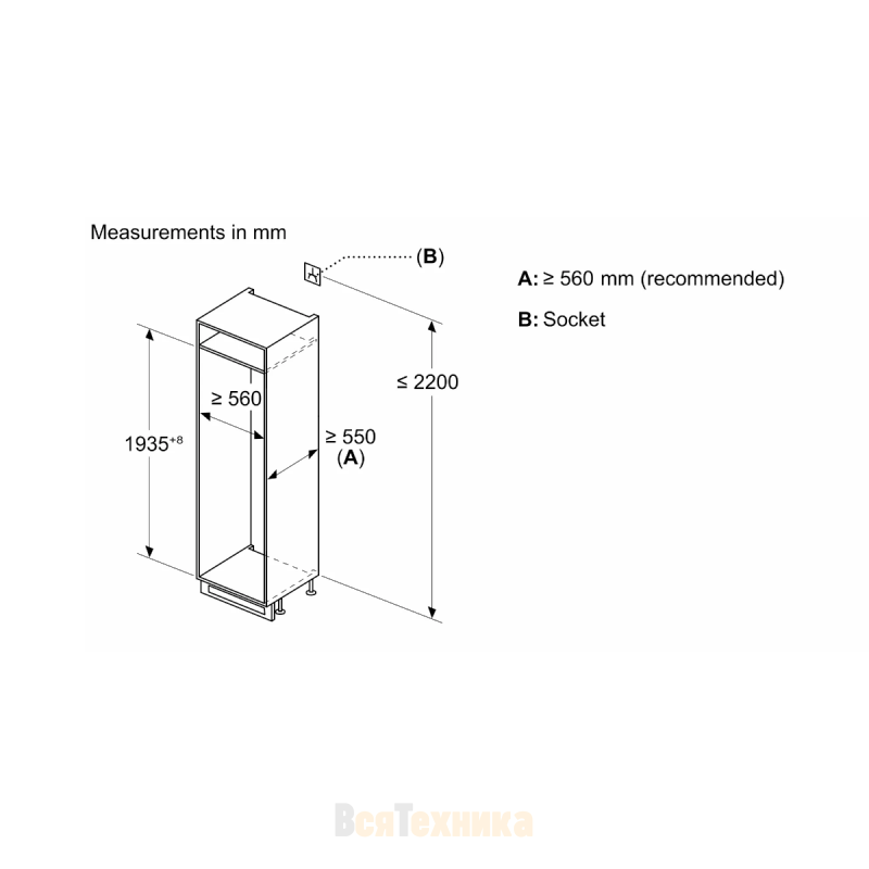 Габаритные параметры устройства составляют 193.5×54.1×54.8 см, что делает его оптимальным решением для встраивания в кухонный гарнитур. Общий объем холодильника — 290 литров, распределенный между холодильной (215 л) и морозильной (75 л) камерами.