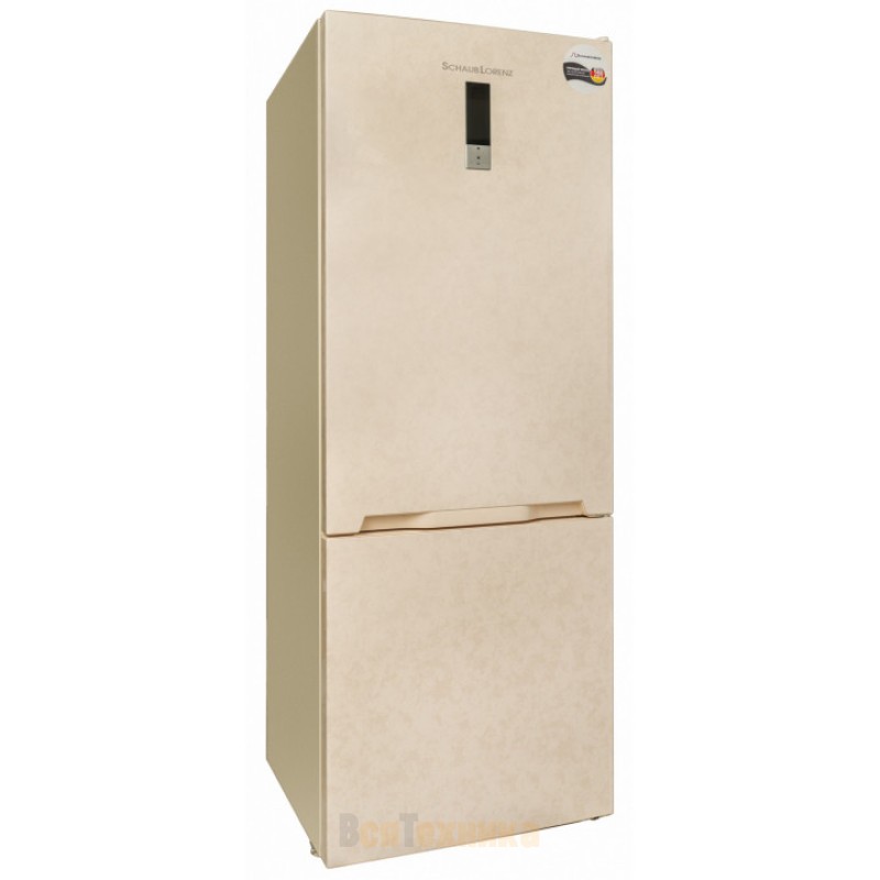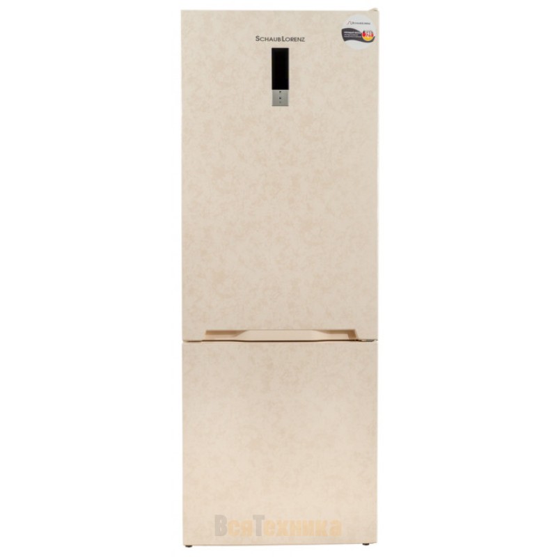 Корпус данной модели Schaub Lorenz покрашен в нестандартный оттенок — мраморный бежевый. Благодаря такому цветовому решению она отлично подходит кухне в классическом дизайне, интерьеру в стиле «прованс» и другим вариантам мебели в светлой, песочной гамме. Снаружи на двери расположена панель управления — сенсорный дисплей и кнопки выбора функций. Благодаря этому легко регулировать температуру в камерах и выбирать дополнительные режимы, например, экономии энергии или суперзамораживания.