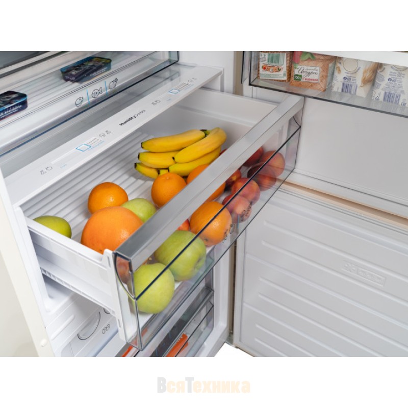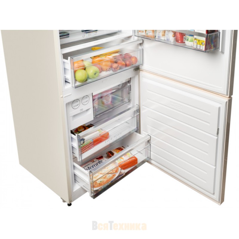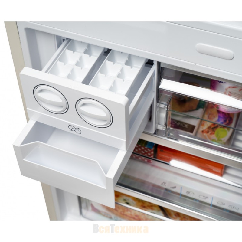 В холодильном отделении находится отдельный ящик зоны свежести — в нем ваши овощи, фрукты, зелень дольше сохранят свои полезные свойства. Во втором ящике поддерживается температура остальной камеры, поэтому в нем не установить специальные условия. В морозильном отделении расположен небольшой отсек для приготовления льда.