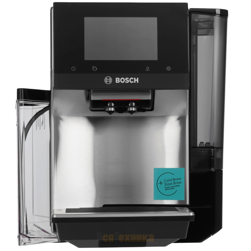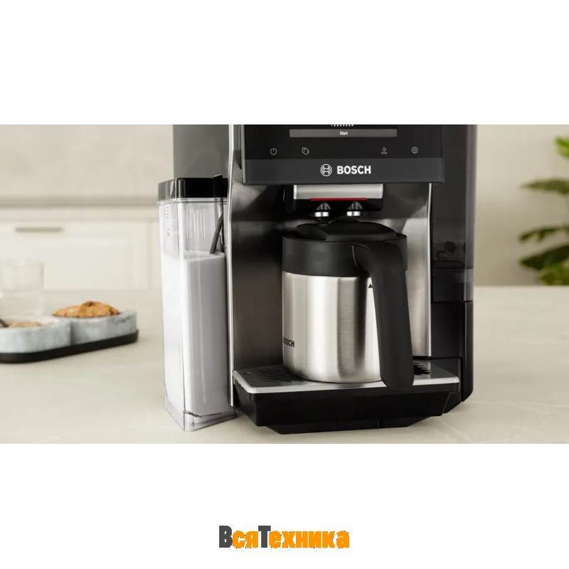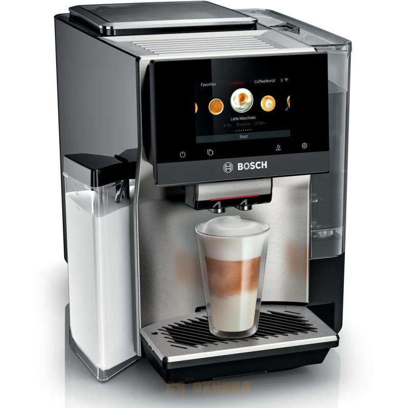 Полностью автоматическая кофемашина Bosch TQE80703 с интегральной капучинатором, рассчитанная на приготовление 36 видов напитков из свежесмолотых зерен. Выполнена в премиальном дизайне из нержавеющей стали и пластика. Оснащена керамическими жерновами, автоматической системой очистки молочной линии (milkClean), функцией одновременного приготовления двух чашек (OneTouch Double Cup) и поддержкой умного управления Home Connect. Компактные габариты и интуитивный сенсорный интерфейс делают её идеальной для ежедневного использования.