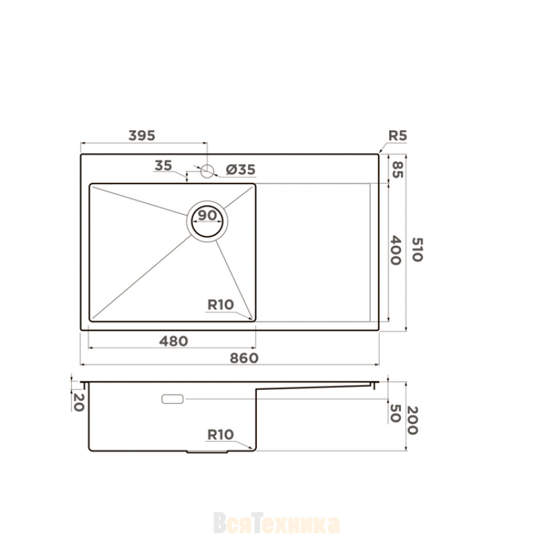 Размеры: ширина 860 мм x длина 510 мм x глубина 200 мм