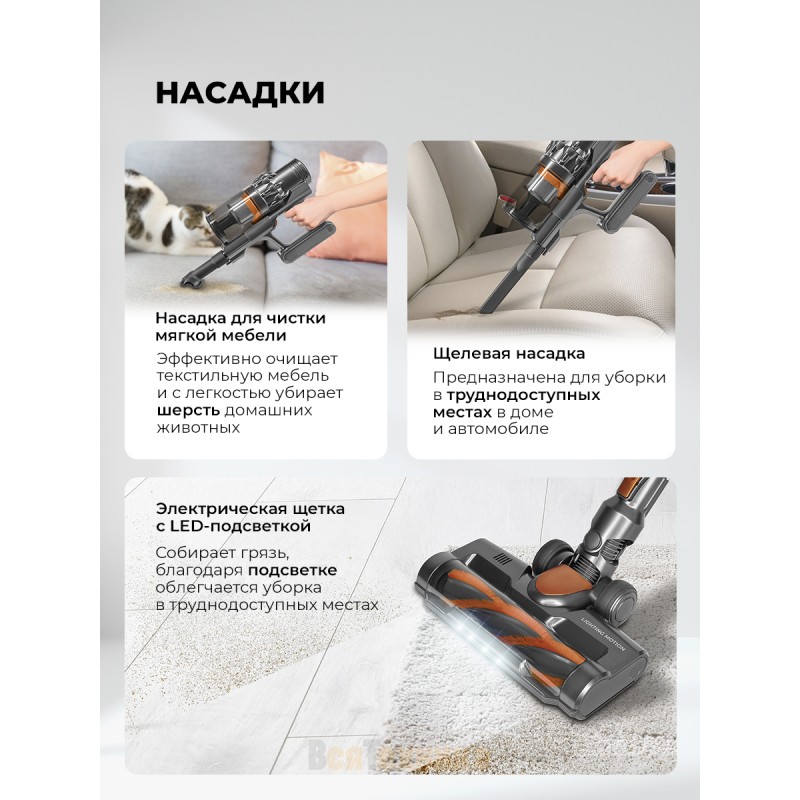 Турбощетка с универсальной насадкой Hard Brush поможет справиться с любыми типами мусора, включая волосы и шерсть домашних животных. Турбощетка имеет подсветку зоны очистки, что облегчает уборку в труднодоступных местах.