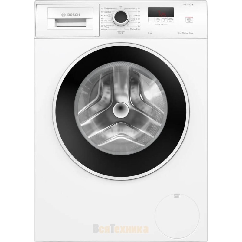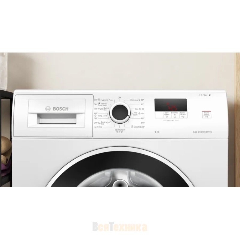 Стиральная машина Bosch WGE03200BY имеет современный белый корпус, выполненный в лаконичном стиле серии Serie 2, гармонично вписывается в интерьер любой прачечной или ванной комнаты. Высота 84.8 см и стандартная ширина 59.8 см создают удобный встроенный в ряд предмет быта силуэт, а глубина 58.8 см обеспечивает компактность при сохранении вместительности барабана 65 л. Конструкция опирается на продуманную систему AntiVibration, которая снижает вибрации и улучшает устойчивость при высокоскоростном отжиме до 1200 об./мин., сохраняя соседние поверхности в покое и уменьшая шум.