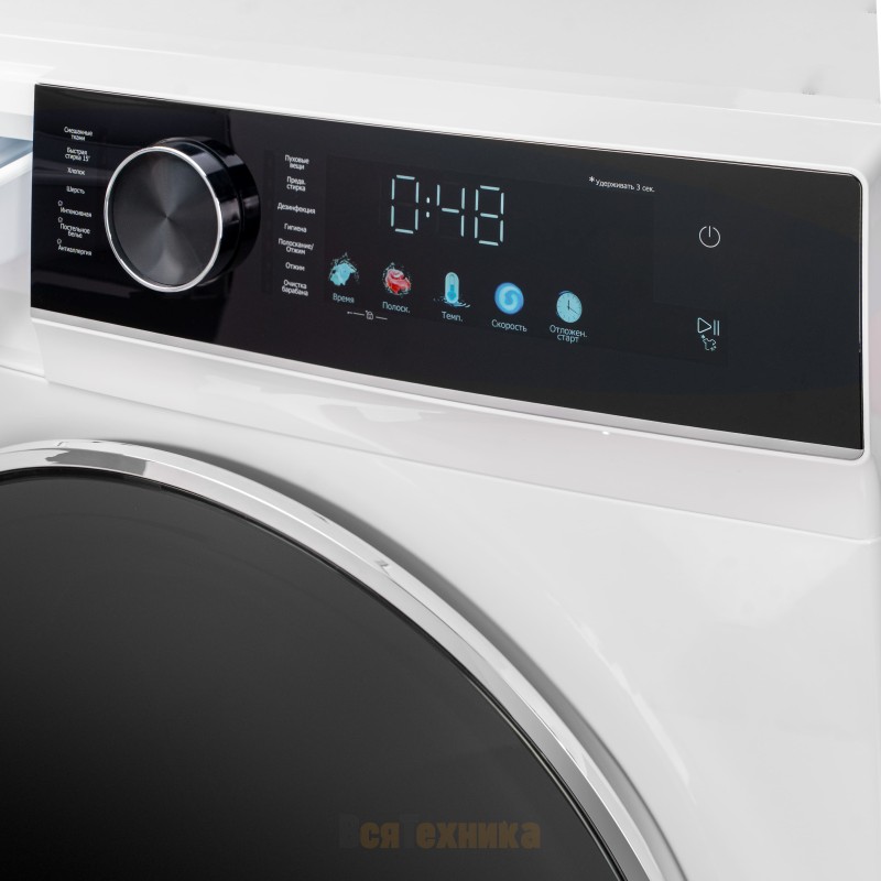 Электронная система управления с удобным дисплеем позволяет легко выбирать нужные режимы, а функция отложенного старта с диапазоном от 3 до 24 часов помогает планировать стирку заранее. Предусмотрены функции очистки барабана, защиты от протечек и блокировки от детей.