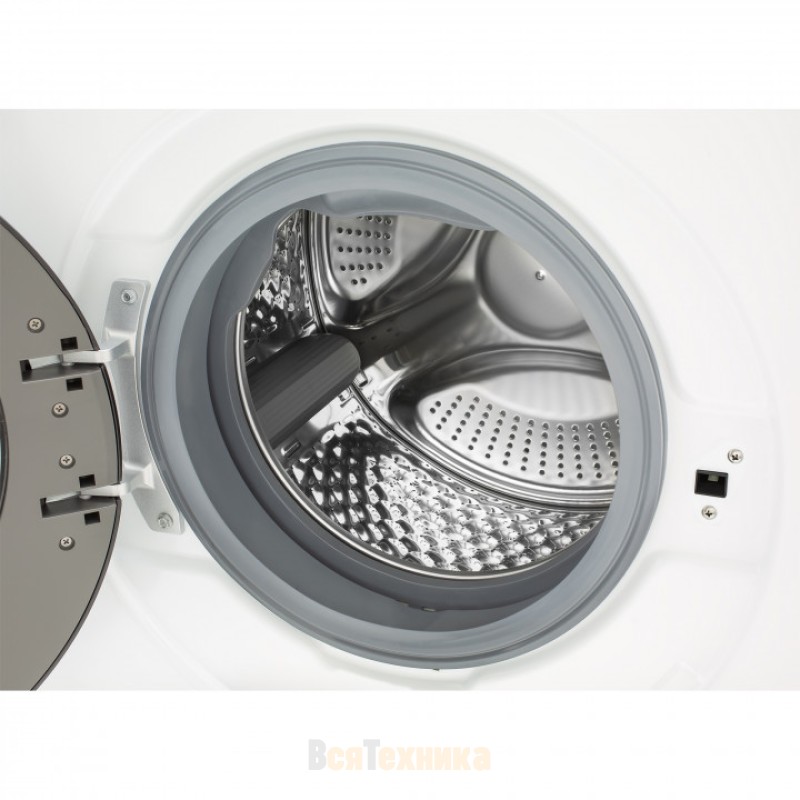 Машина оснащена инверторным двигателем, обеспечивающим тихую работу и долговечность. Уровень шума при стирке не превышает шестидесяти децибел. Для различных типов тканей предусмотрено двенадцать программ стирки, включая специальный гипоаллергенный режим, и три программы сушки. Функция "Сухая стирка" предназначена для обеззараживания вещей, не переносящих влажную обработку.