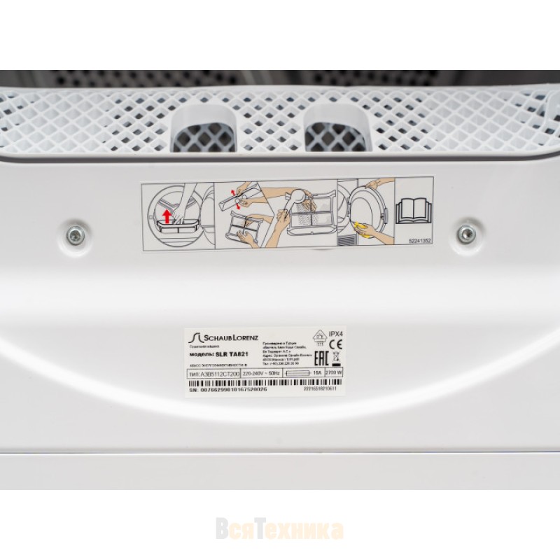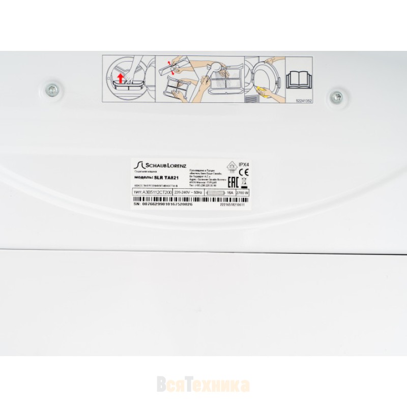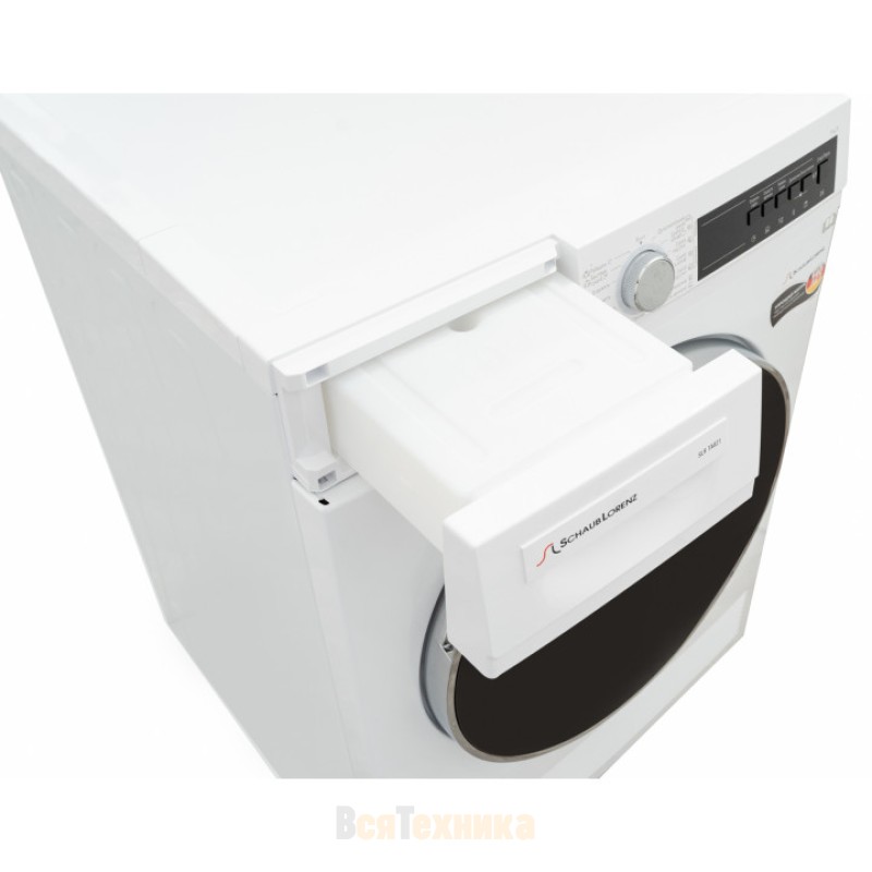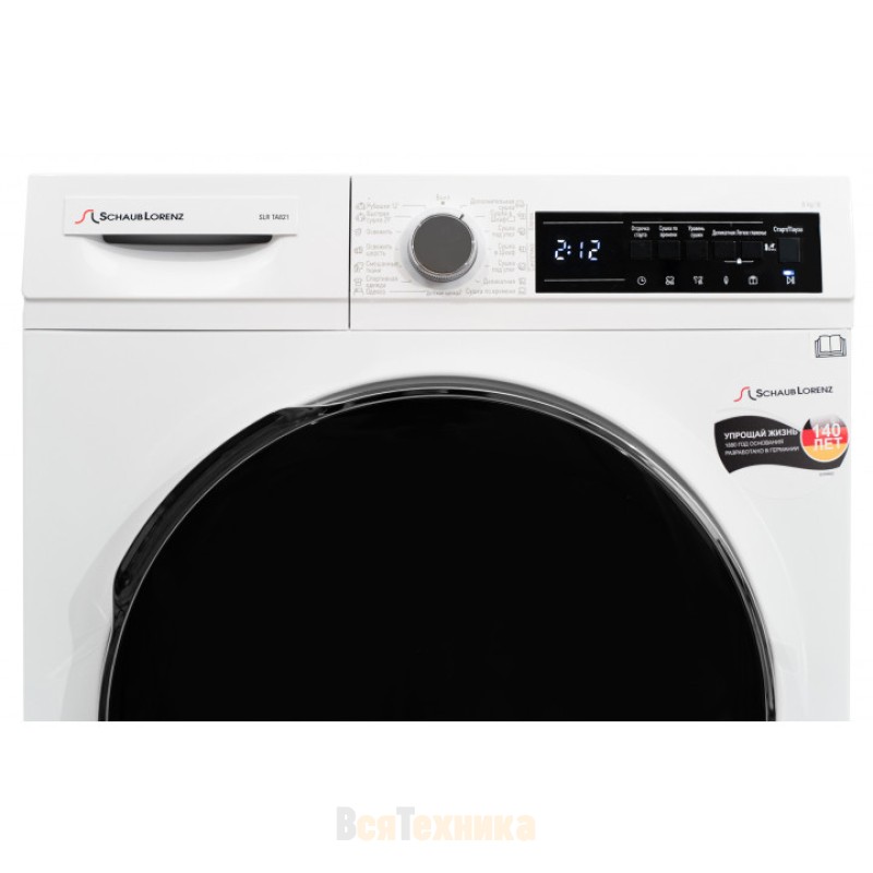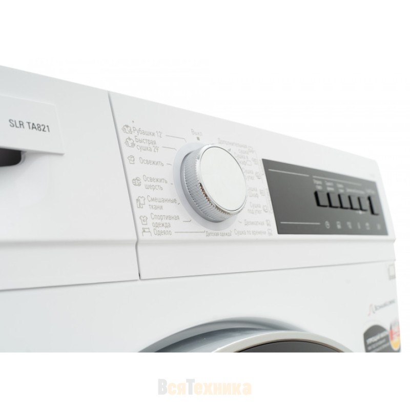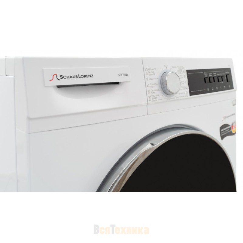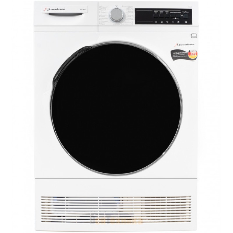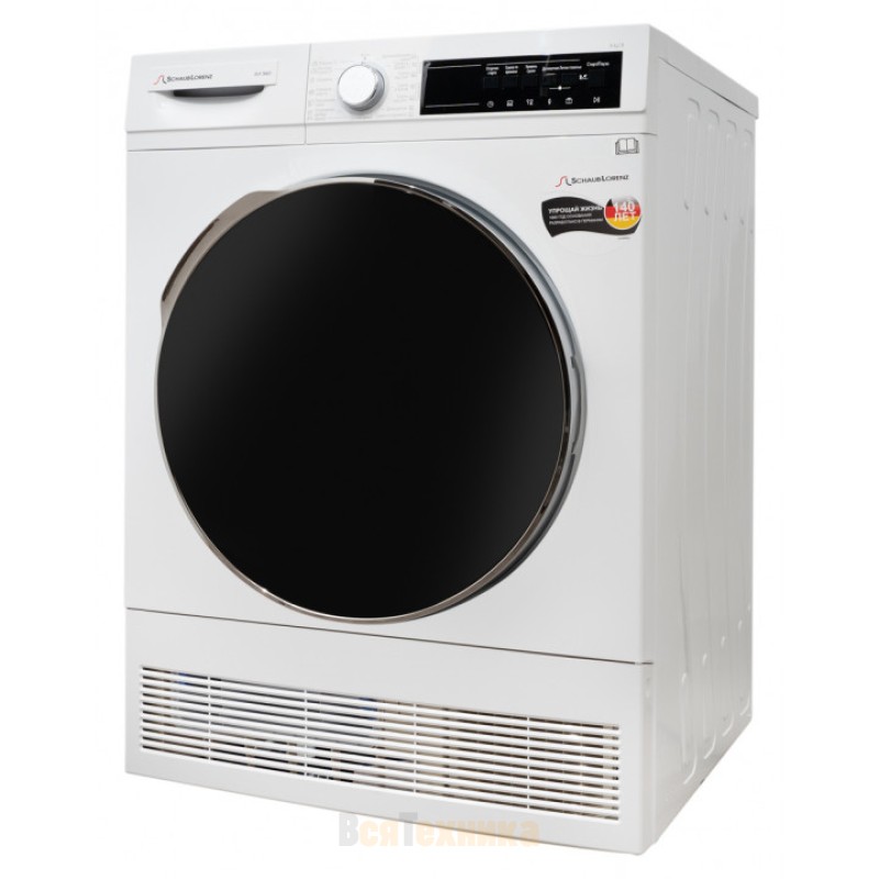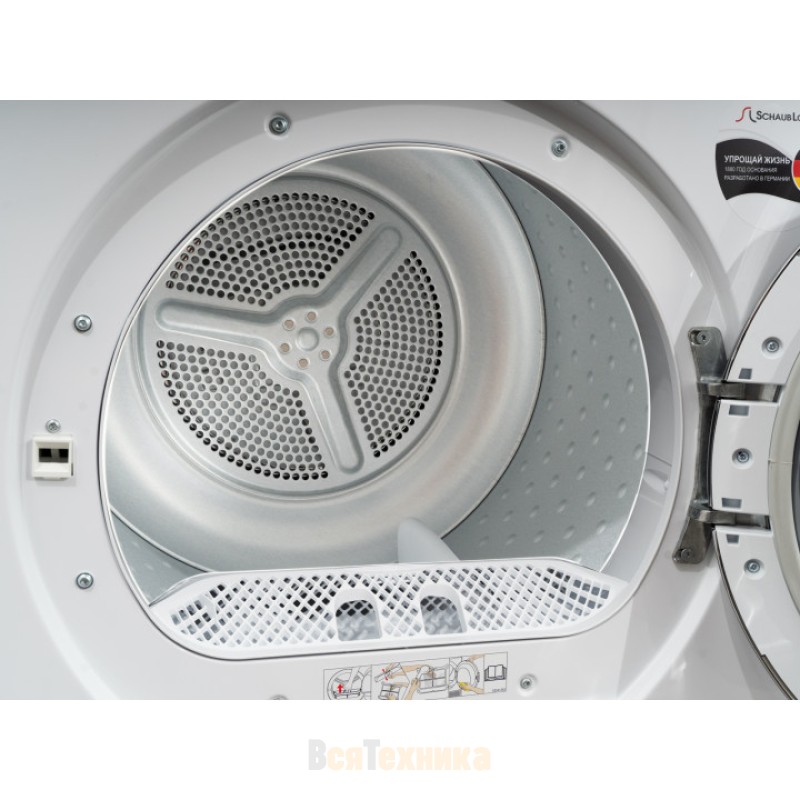 Модель Schaub Lorenz SLR TA821 работает по принципу конденсации: нагретый воздух поступает в барабан, под его воздействием из ткани испаряется влага — эти испарения отводятся в специальный отсек, где оседают. При нескольких повторах цикла белье полностью высыхает.