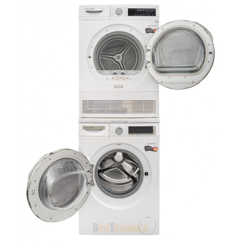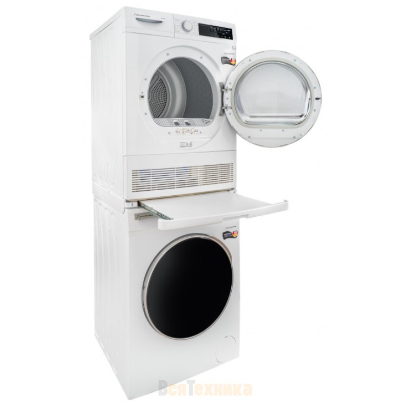 Машинку можно установить отдельно или в колонну со стиральной — для этого необходимо дополнительно приобрести соединительный элемент.
