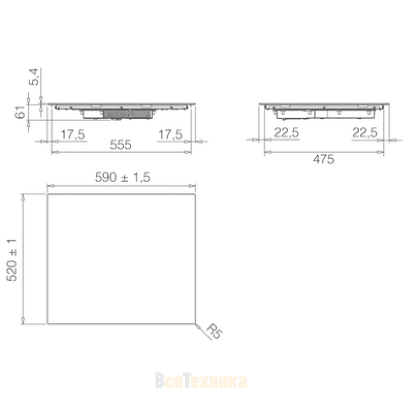 Поверхность выполнена из прочной стеклокерамики в чёрном цвете, устойчива к царапинам, нагреву и легко очищается после использования. Возможность встраивания в один уровень со столешницей обеспечивает аккуратный внешний вид и удобство при уходе. Габариты панели составляют 59 см в ширину, 52 см в глубину и 5.5 см в высоту, что делает её совместимой с большинством кухонных пространств.