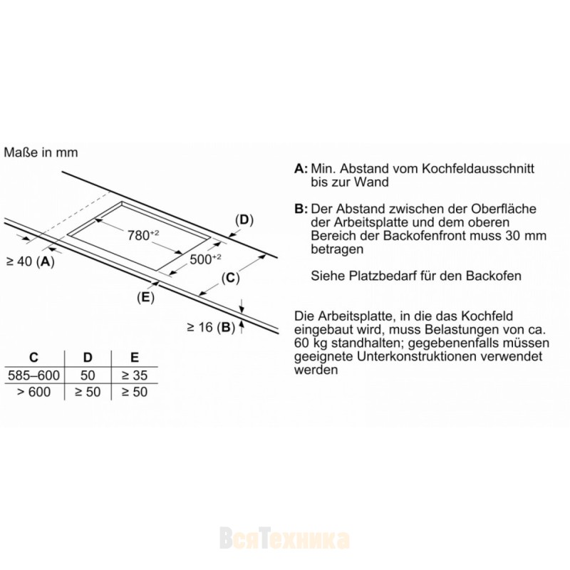 В комплект поставки входят установочный набор, инструкция и сетевой кабель. Для монтажа требуется ниша шириной 78 см, высотой 5,5 см и глубиной 50 см; толщина столешницы должна быть не менее 1,6 см. На устройство предоставляется гарантия сроком 2 года.