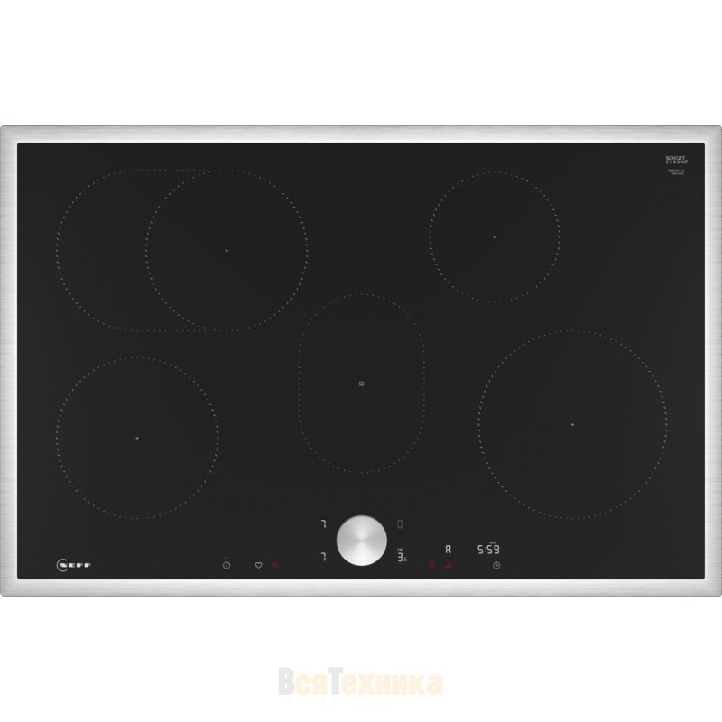 Индукционная варочная панель NEFF T58STF1L0 представляет собой современное решение для кухни премиум-класса с элегантным дизайном в черном цвете и обрамлением из нержавеющей стали.