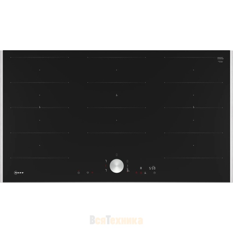 Индукционная варочная панель NEFF T69TTX4L0 представляет собой премиальное решение для современной кухни, выполненное в элегантном черном цвете с металлическими профилями по бокам.