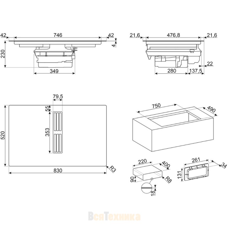 Габариты и монтаж: Глубина прибора — 44.2 см. Важно: для работы в режиме рециркуляции (без отвода в вентиляцию) необходимо предусмотреть место внутри шкафа острова для установки угольных фильтров и циркуляции очищенного воздуха.