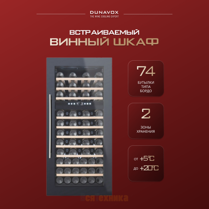 Все самые важные элементы собраны вместе — азбука хранения вин. Приобретая винный шкаф Dunavox DX-74.230DB, вы делаете шаг в новый, профессиональный мир хранения вин. Ведь все знают, что вино — это отражение души. Храните вина правильно вместе с Dunavox!