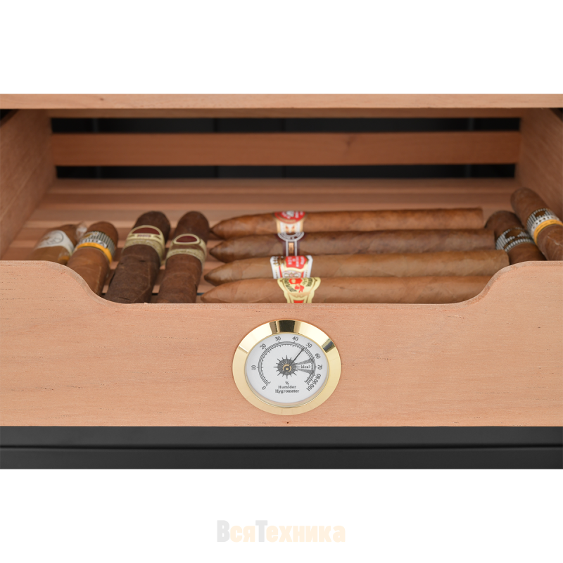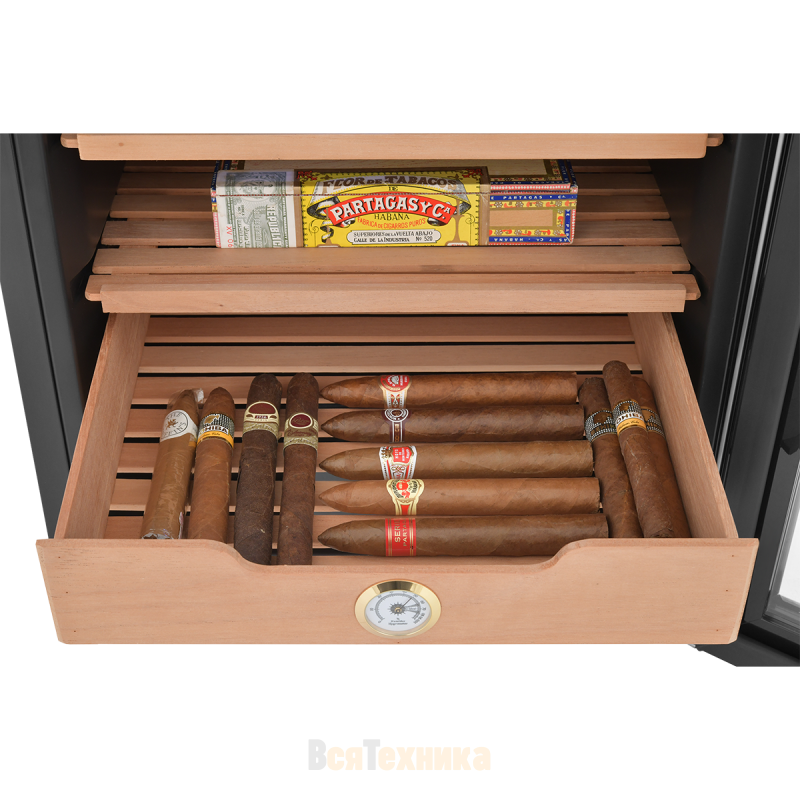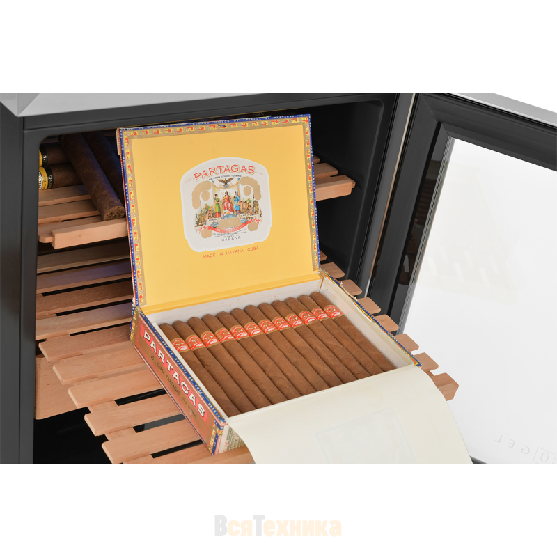 Вместимость 8 бутылок и 560 сигар, объём 70 литров