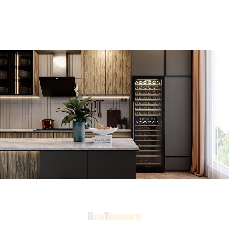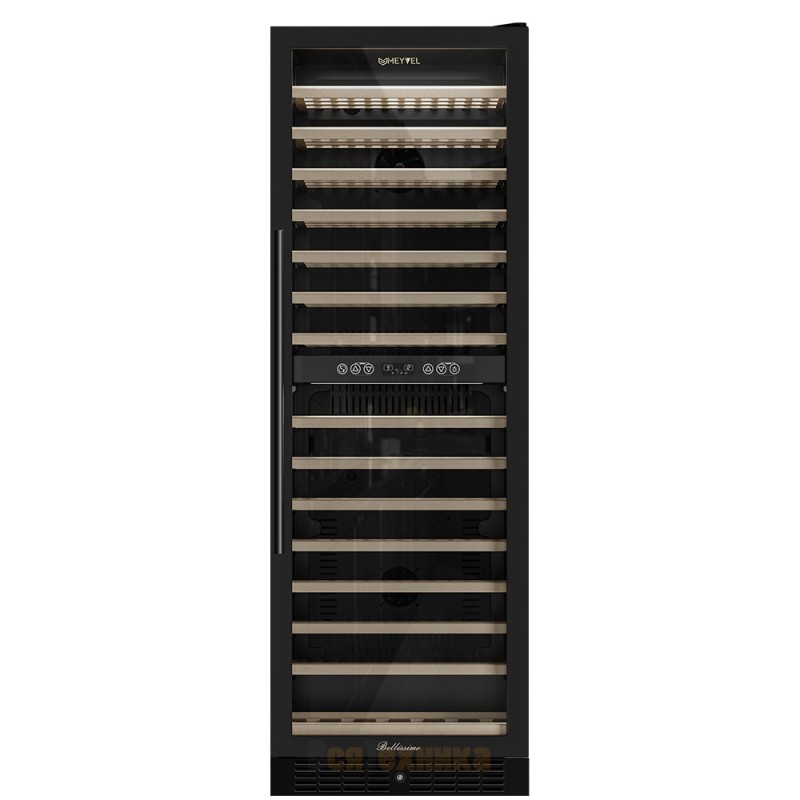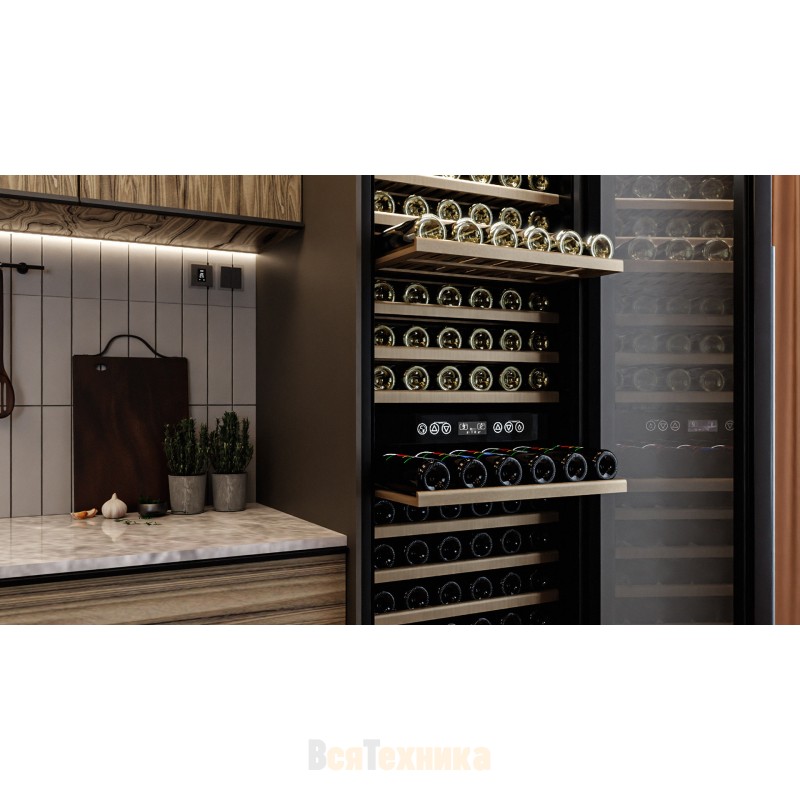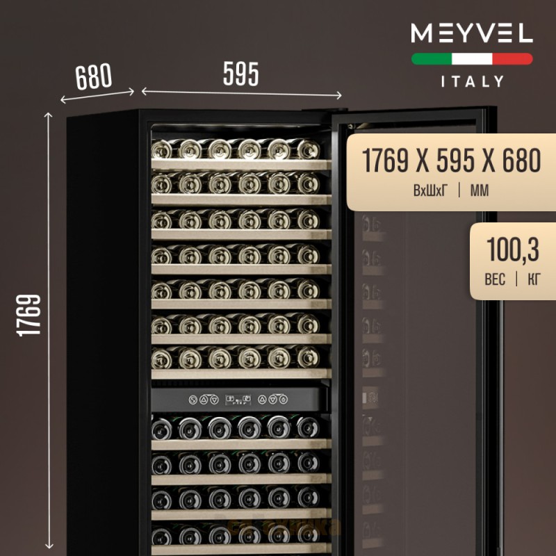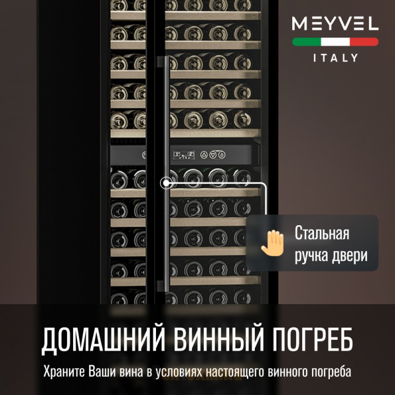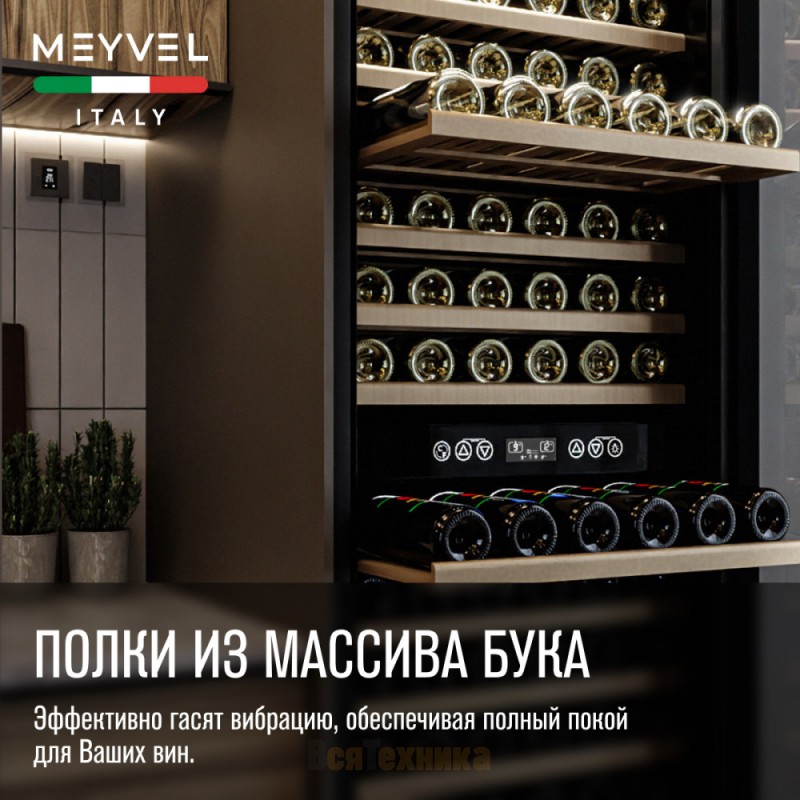Компрессорный винный шкаф Meyvel MV160-KBT2 обладает большой вместимостью и способен разместить до 160 бутылок. Располагаются они на полках из массива бука. Внутреннее пространство шкафа разделено на 2 температурные зоны с возможностью настраивать каждую из них: диапазон нижней зоны от +10°C до +18°C, а верхней - от + 5°C до +10°C. Холодильник поддерживает влажность в диапазоне 60-80%, как в настоящем винном погребе.