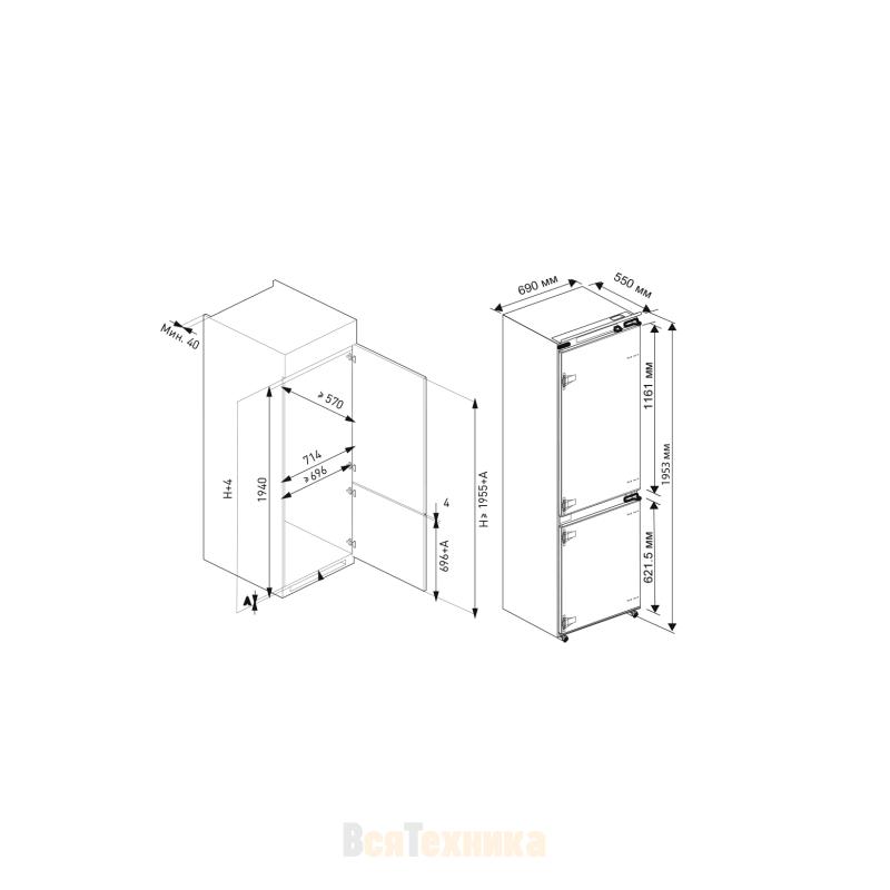 Габариты модели составляют 195,3×69×55 см, при этом она рассчитана на нишу размером 194×69,6×57 см. Вес устройства — 84 кг (91 кг брутто). Холодильник работает на экологичном хладагенте R600a и имеет климатический класс SN/N/ST/T, что обеспечивает стабильную работу при различных температурах окружающей среды.