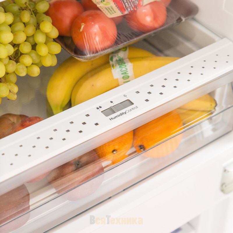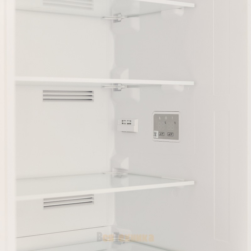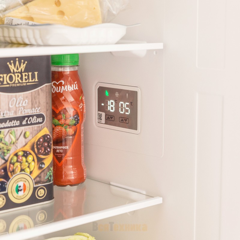 Электронное управление с дисплеем позволяет точно настроить температуру, а наличие индикации упрощает контроль работы прибора. Внутри установлены полки из закалённого стекла, выдерживающие высокие нагрузки, а верхнее LED-освещение делает содержимое хорошо видимым даже при полной загрузке. Модель работает практически бесшумно: уровень шума ограничен тридцатью восьмью децибелами, что особенно важно для кухонь, объединённых с гостиной.