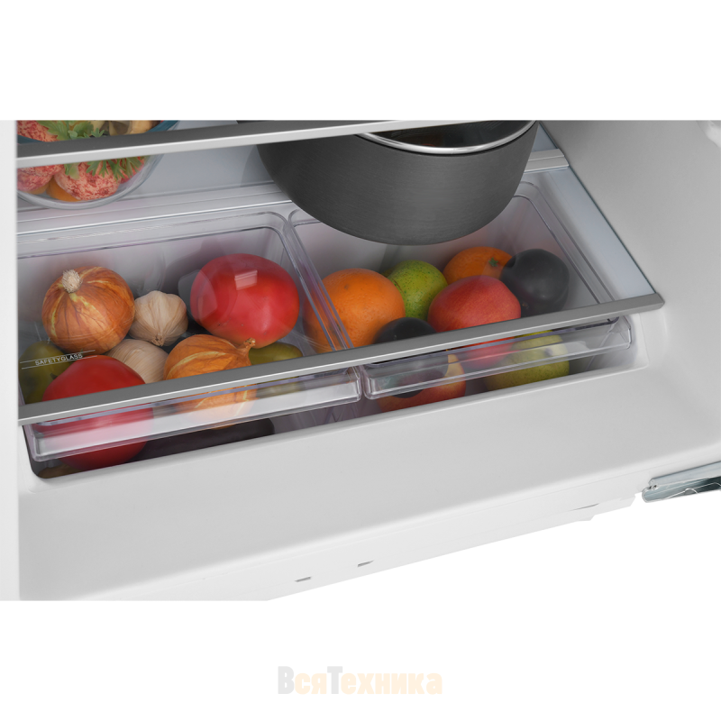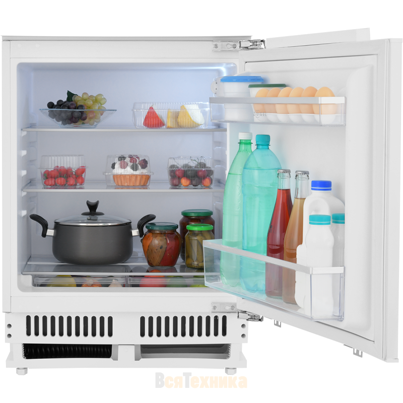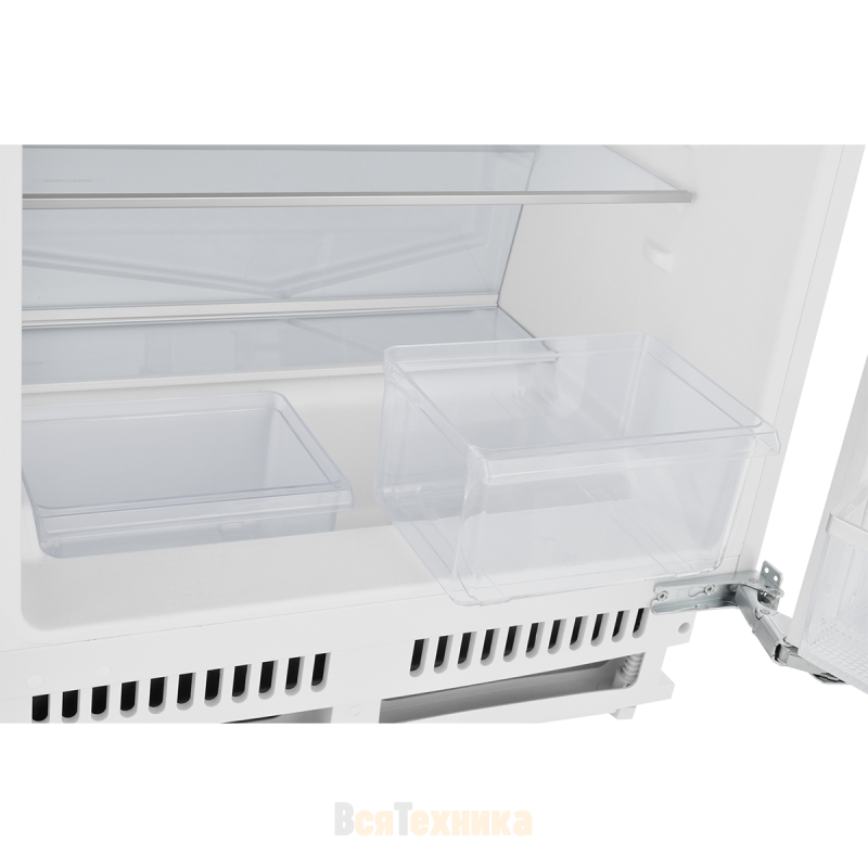 В камере предусмотрено три полки, два вместительных ящика для овощей и фруктов, а также две дверные полки для бутылок и мелких продуктов. В комплект входит подставка для яиц, что повышает удобство использования. Перенавешиваемые двери позволяют выбрать сторону открывания в зависимости от планировки кухни, а жёсткое крепление фасада обеспечивает плотное прилегание встроенной мебели.