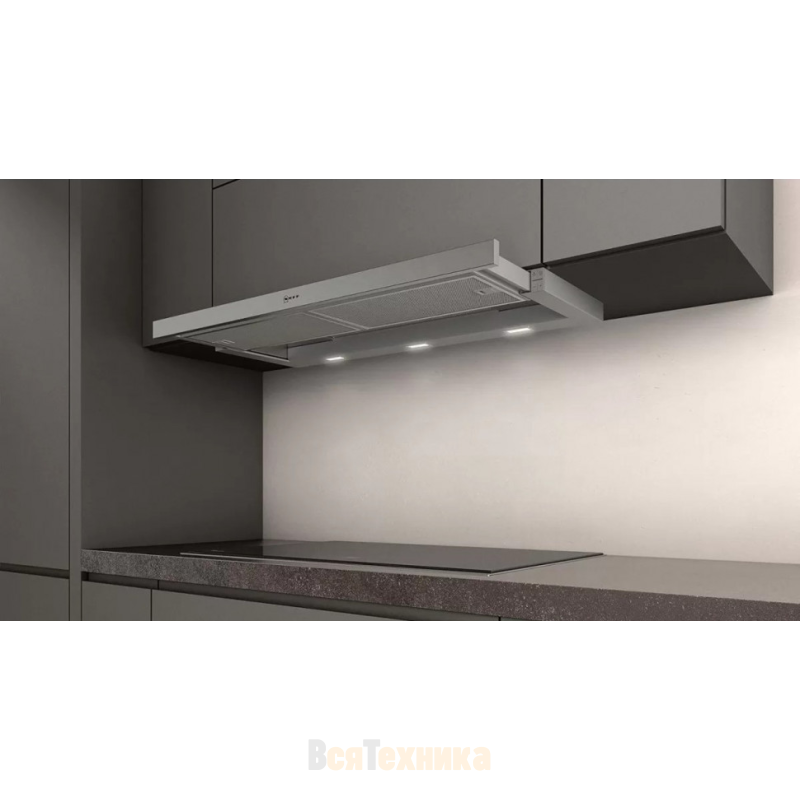 Вытяжка Neff D49ED22X1 представляет собой современную полувстраиваемую модель в серебристом исполнении, которая практически незаметна в кухонном шкафу.
