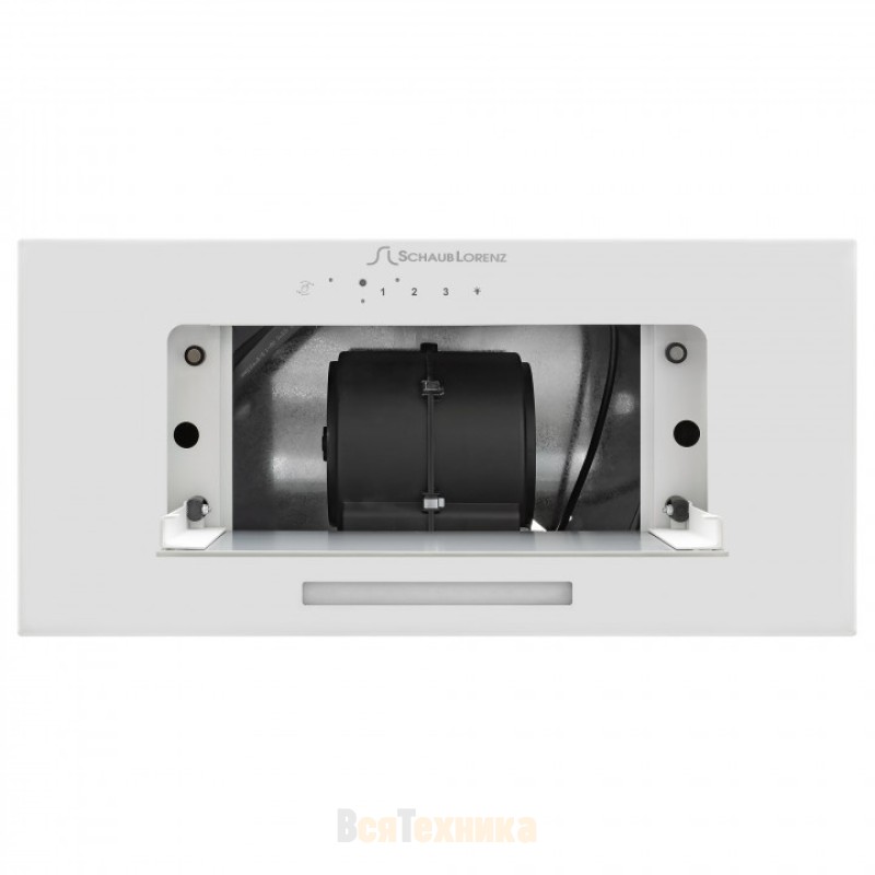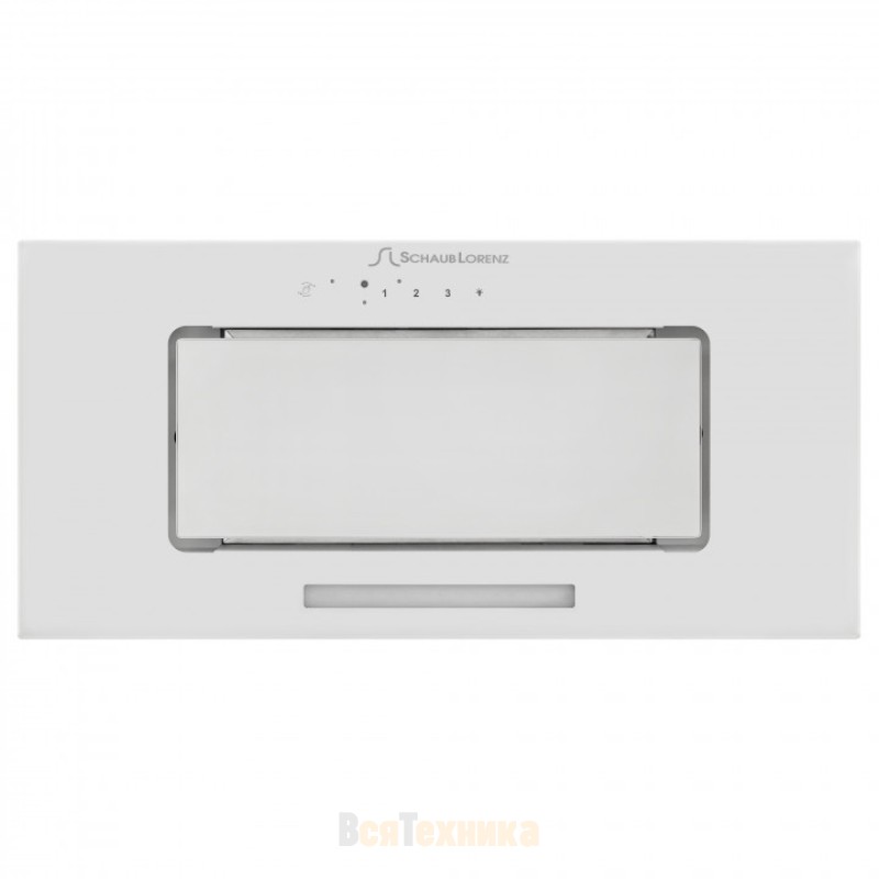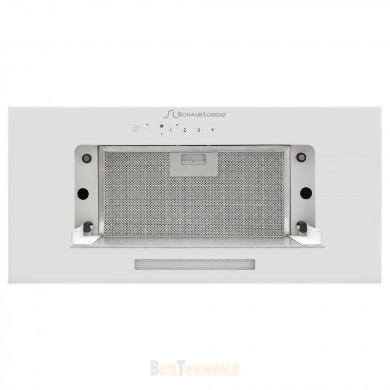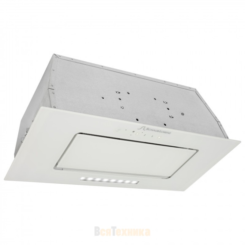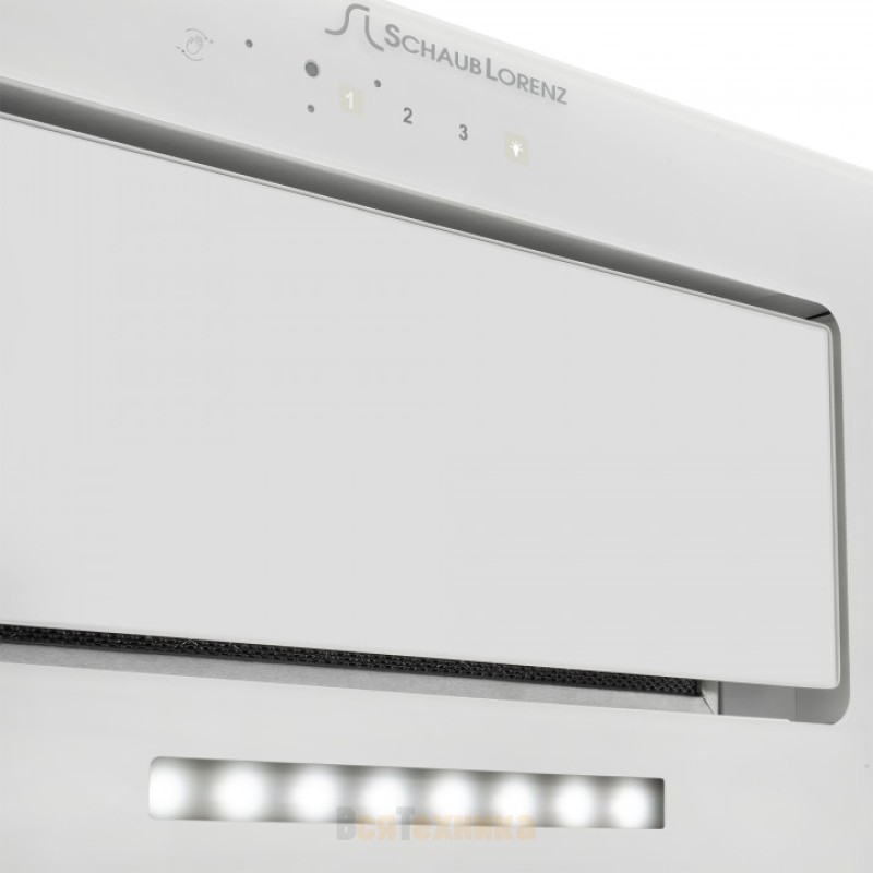 Встраиваемая вытяжка Schaub Lorenz SLD EL5530 белого цвета с вставкой из стекла изготовлена из нержавеющей стали.