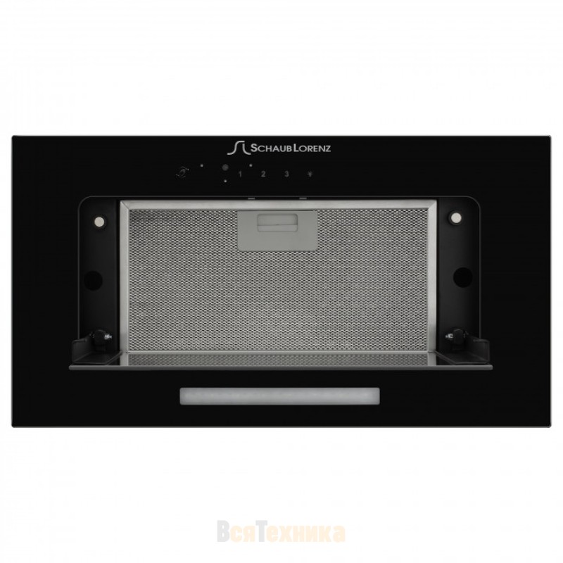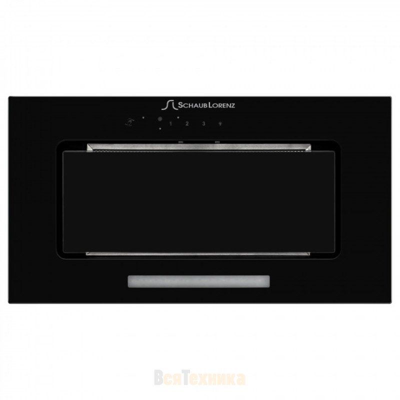 Встраиваемая вытяжка Schaub Lorenz SLD EY5215 черного цвета с вставкой из стекла изготовлена из нержавеющей стали.